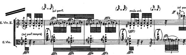 In contemporary art music, composers have played with all extremes of lengths, but the most significant innovations in notation have come, as they did in the Middle Ages and Renaissance, in the notation of the most fleeting notes.[4] One of the most interesting case studies in the continuation of the medieval tradition of shorter notes comes in the American composer George Crumb’s string quartet Black Angels (1970), where, in the excerpt shown in Example 2, he uses a time signature of 7/128 in measure 2--written with the denominator as a note--along with the almost as equally unusual 7/64 with each note receiving an equal accent, thus providing the shortest non-compound meter ever published.